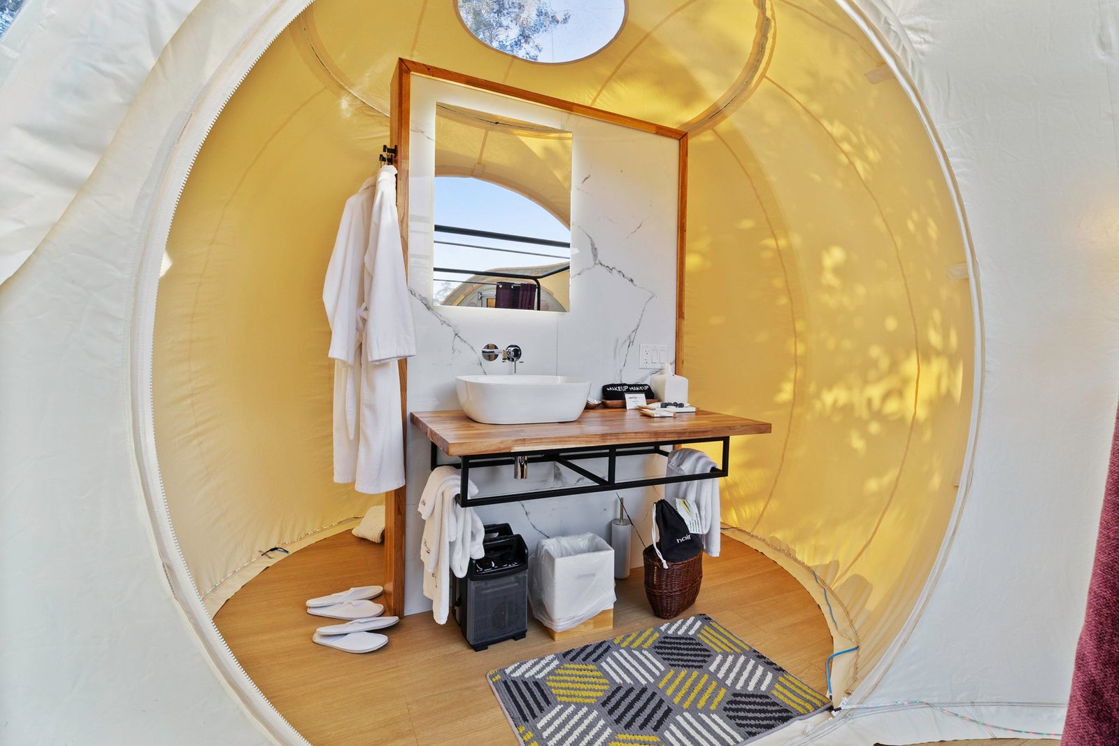 This inflatable bubble is anchored to a sturdy wooden deck and inflated with an air blower. There is a retractable awning that covers the bubble reducing the green-house effect during the daytime and can be opened to reveal the beautiful skyline during the day or the wonderous starlit sky at night.